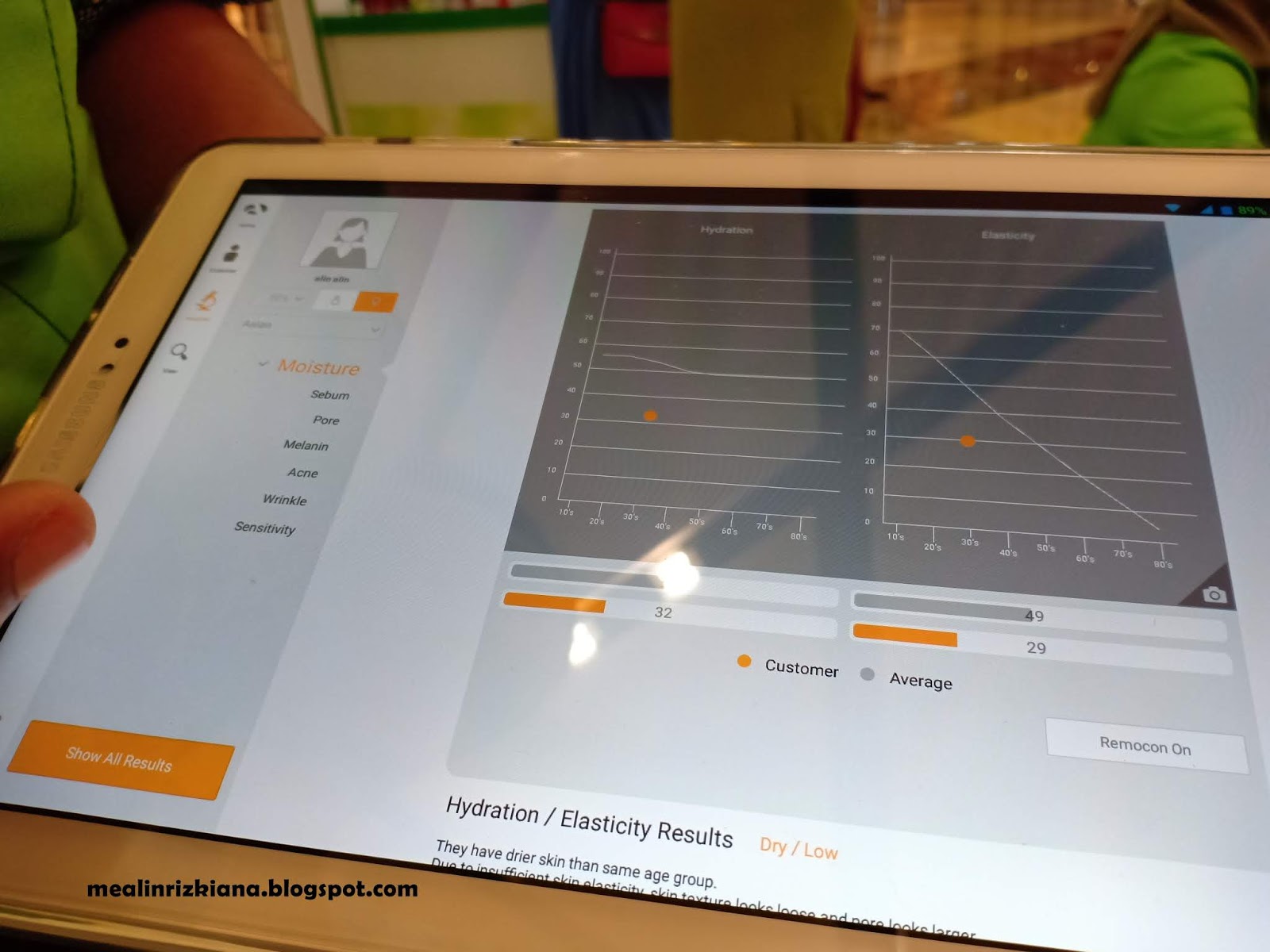 Tes pertama dimulai dari tingkat kelembapan di dalam kulit kita. Si mba nya ini mulai menempelkan mesinnya ke kulit wajah. Nah, kalian bisa lihat di layar hasilnya ya. Jadi penjelasan dari si mba nya itu, kulit saya termasuk kering dan termasuk kategori dengan kelembapan yang rendah. Karena kulit saya yang kurang lembap, otomatis elastisitas kulitnya pun ikut rendah.